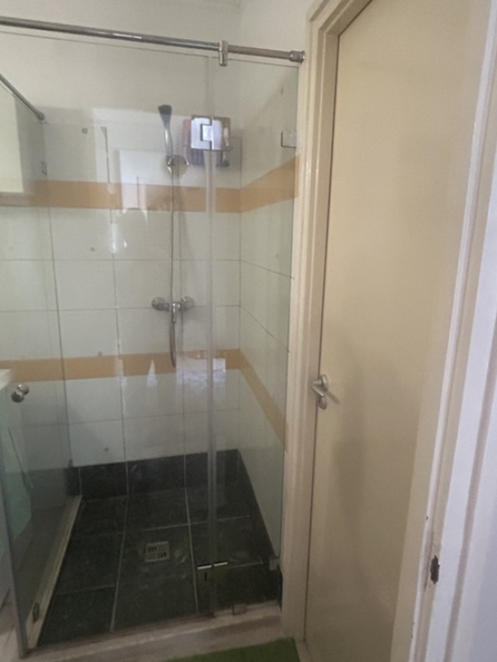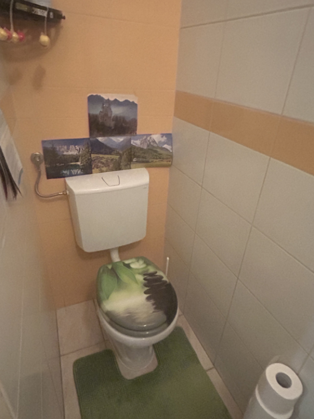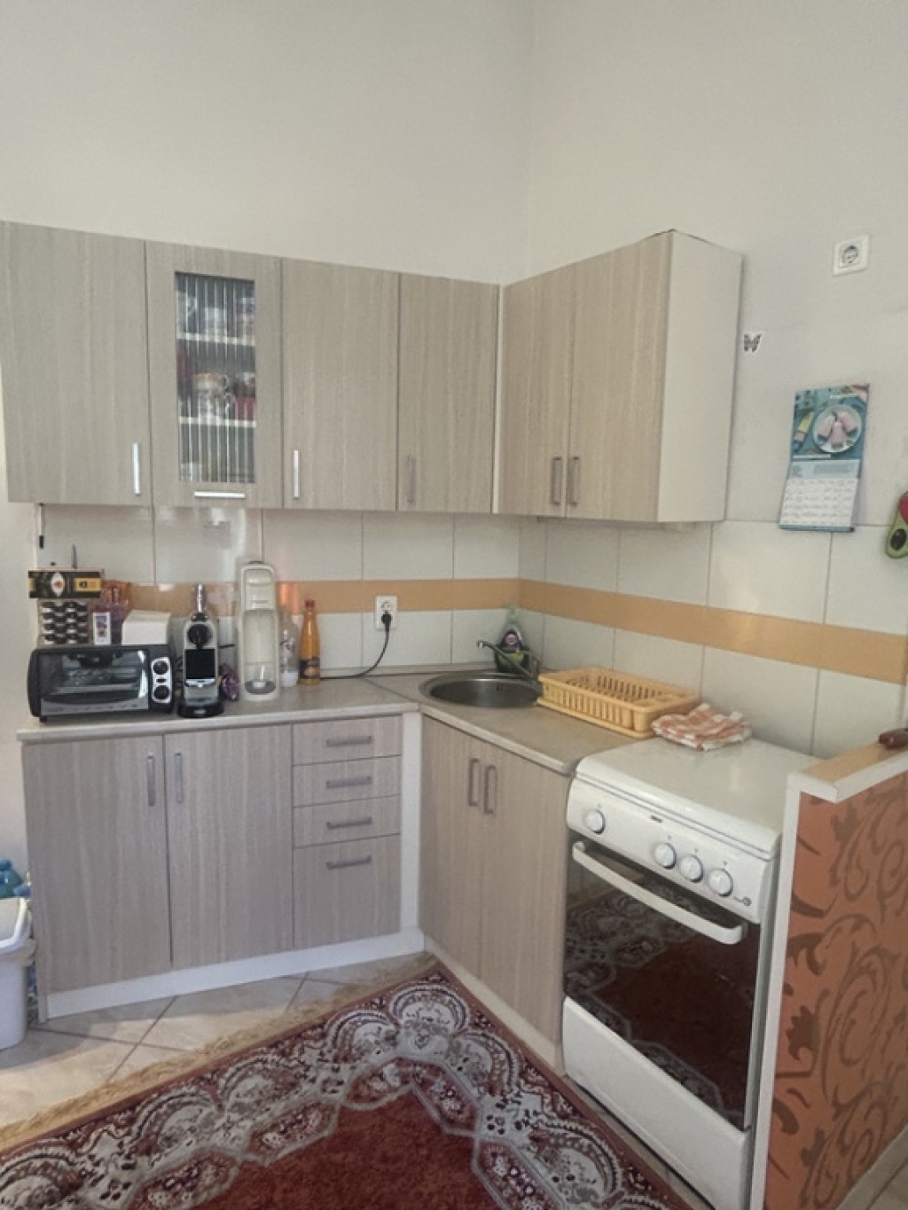 Az ablakos konyha konyhabútorral és gáztűzhellyel felszerelt járólappal burkolt.A fürdőszoba mosdóval, zuhanykabinnal felszerelt, a toalett külön helységben kapott helyet.