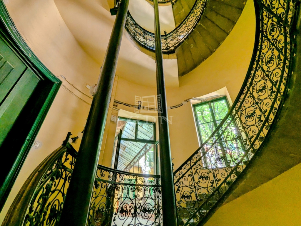 This charming property is located on the first floor of a historic eclectic–neoclassical building dating from around 1880, featuring thick brick walls, impressive ceiling height (4.6 m!), and a unique curved interior layout. The building surrounds a large inner courtyard filled with mature trees and greenery — a peaceful oasis in the heart of the city. A rare bonus is a private on-site parking space, which belongs to the current owner.