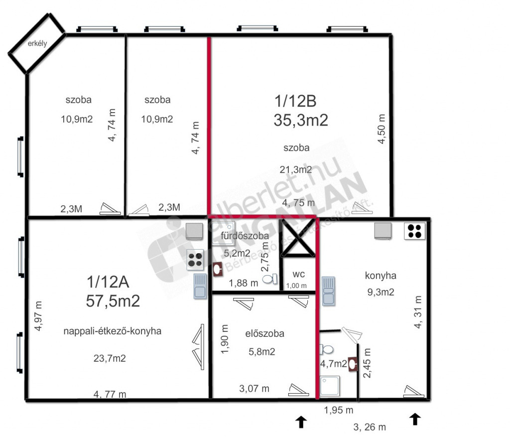 Mindkét rész külön bejárattal rendelkezik a folyosóról, valamint külön víz-, gáz- és villanyórával felszerelt, így teljesen önálló egységként üzemeltethetők.