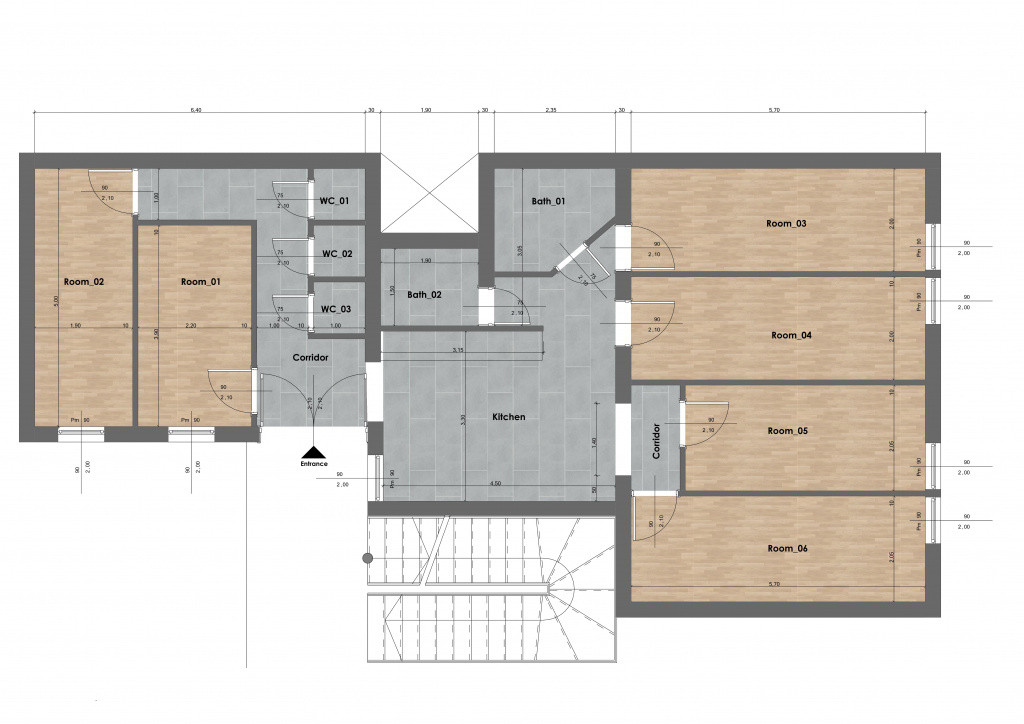 - 6 (4 egész és 2 fél) teljesen külön bejáratú, szeparált, zárható szobássá van kialakítva, ebből 4 utcai fekvésű,