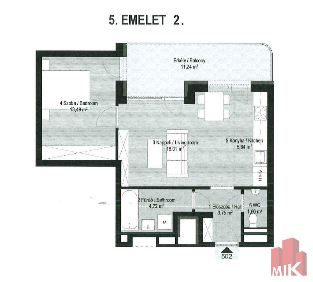 5. emelet 2 szobás 47,65 m2 + terasz 11,24 m2 - 106.000.000.-Ft (502-es)