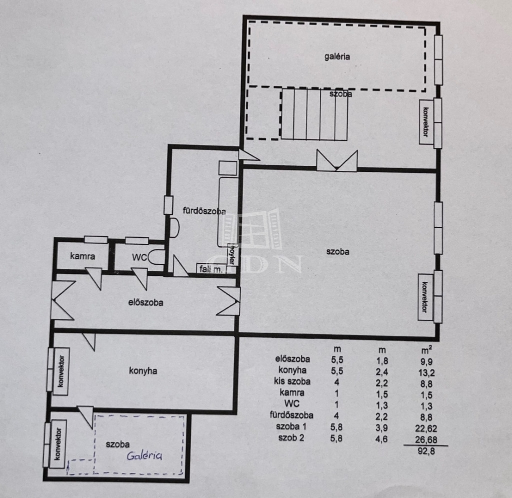 A lakás 2+1 szobás, külön konyhával, valamint nagy belmagassággal rendelkezik. Az otthon különlegessége a dupla galéria, amely kiválóan növeli a hasznos alapterületet, így ideális lehet akár dolgozósarok, hálórész vagy tároló kialakítására. A műanyag nyílászárók korszerűek, a fűtést gázkonvektorok biztosítják.