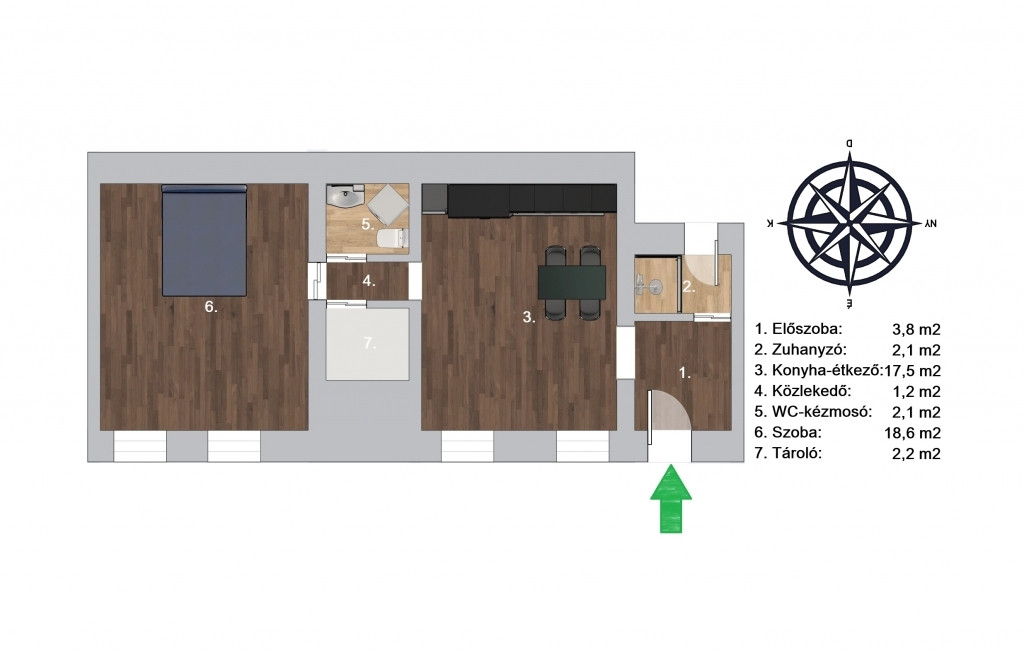 - Jelenlegi felosztása: előszoba, nappali-konyha-étkező, hálószoba, zuhanyzó, wc-mosókonyha.
