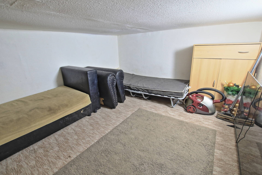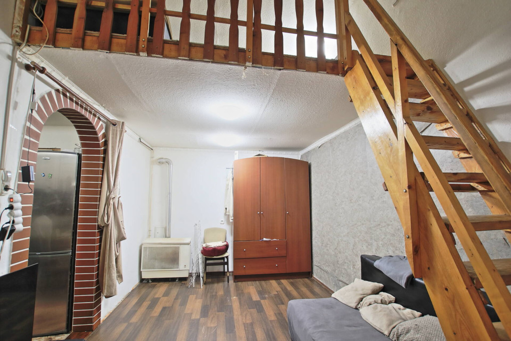 A lakás korszerű, műanyag bejárati ajtaján belépve a konyhába érkezünk, ahol egy kis étkezőasztal is elfér. A helyiség végén alakították ki a zuhanyzóval felszerelt fürdőszobát, mely fölött egy tárolásra, de akár alvásra is alkalmas galériát építettek. A laminált padlóval burkolt szobában szintén készítettek egy impozáns méretű galériát, mely nem csak hálóhelyiségként, de tárolószekrények elhelyezésével akár gardróbnak is használható.