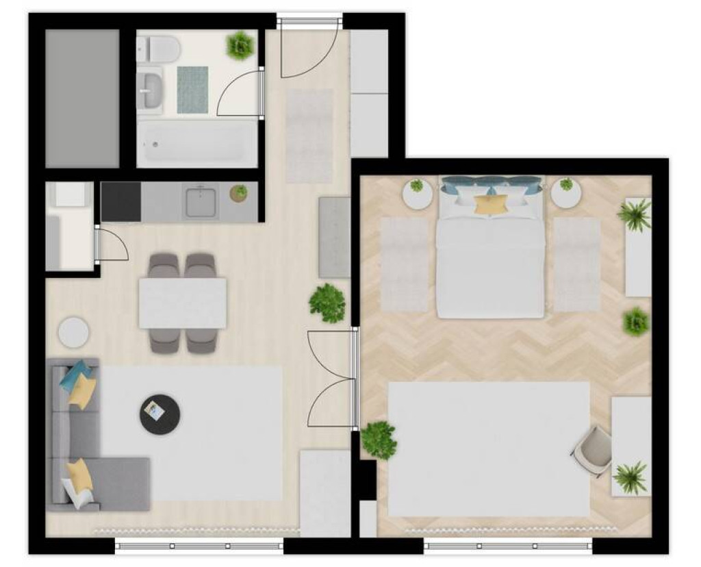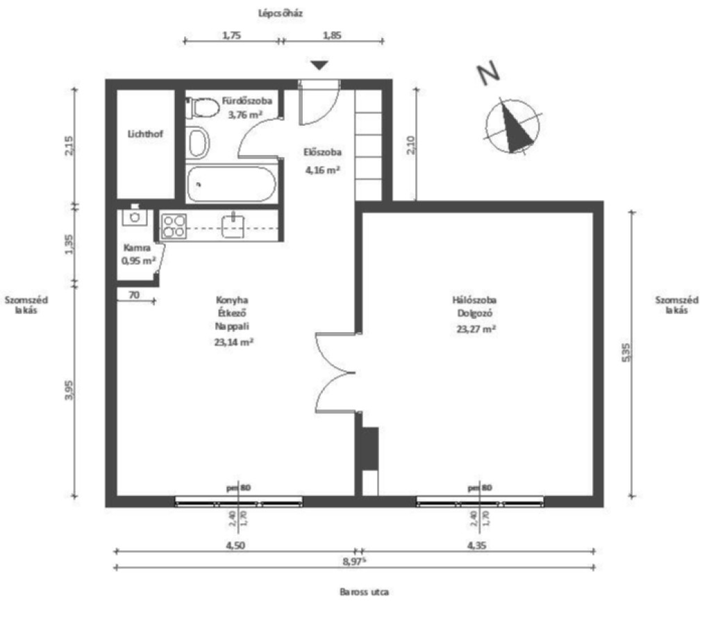 Modern burkolatok, stílusos konyha és fürdő, új vagy felújított nyílászárók, minden részletében friss, lendületes hangulatot áraszt. A két szoba ideális elrendezésű: amerikai konyhás nappali és tágas hálószoba biztosítja a kényelmet és a funkcionális elosztást.
