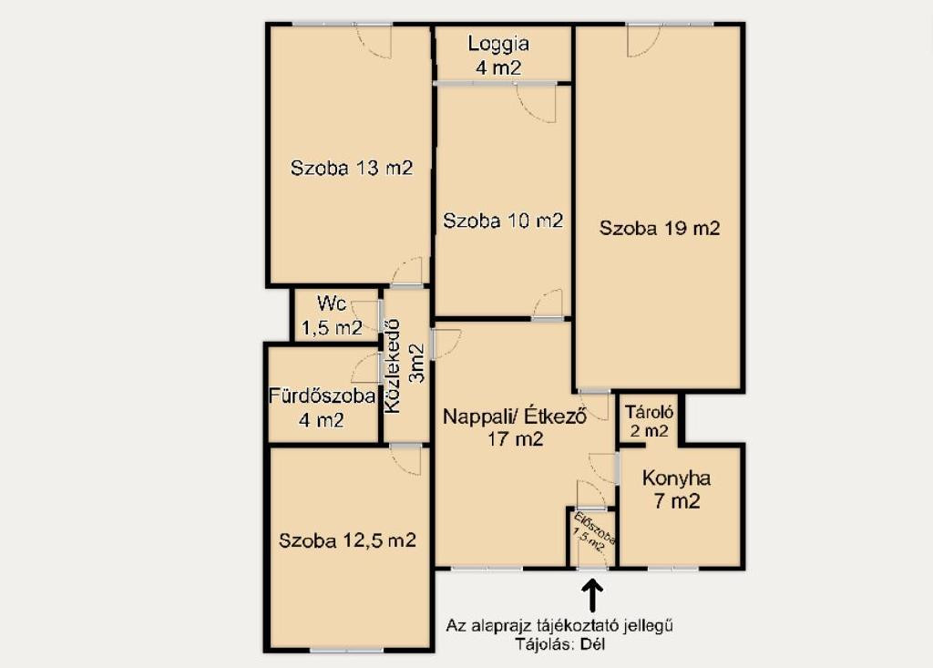 A lakás elrendezése kényelmes és jól átgondolt. A külön nyíló szobák mellett tágas étkező - nappali rész, önálló konyha tárolóval, fürdőszoba, valamint külön WC áll rendelkezésre. A déli tájolásnak köszönhetően a helyiségek egész nap világosak.