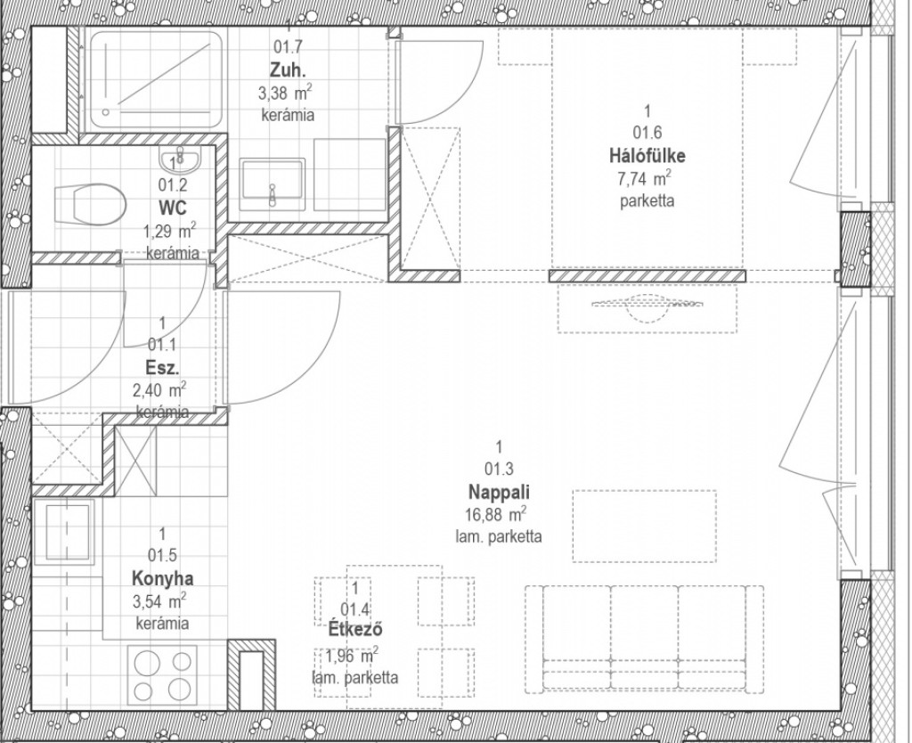 30 lakás és egy üzlet kerül kialakításra, melyekhez 32 db parkolóhely kapcsolódik.