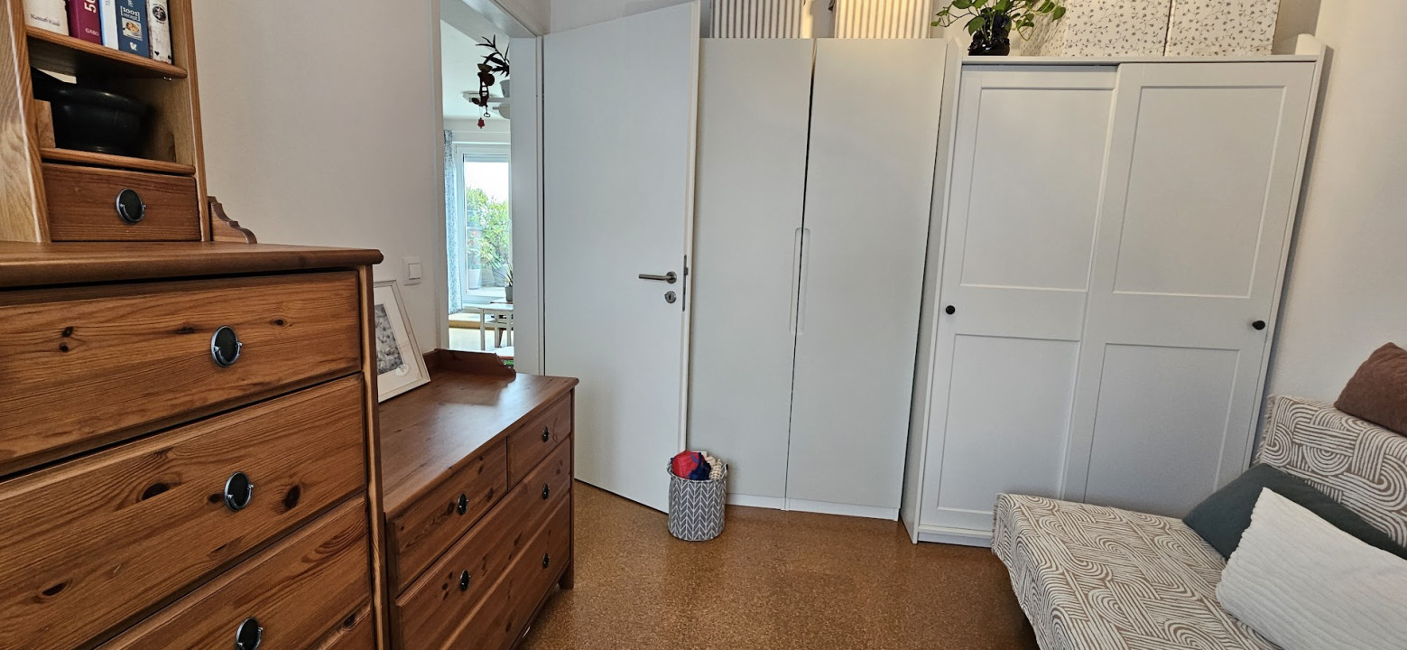 A belső kertre néző teraszról, lépünk be a biztonsági bejárati ajtón át az előszobába, az itt lévő IKEA PAX és SONGESAND gardróbok a vételárba beszámítanak. A kialakításban szempont volt az igényes burkolatok használata, a parafa lamináltparketta modern, letisztult, meleg hangulatú.