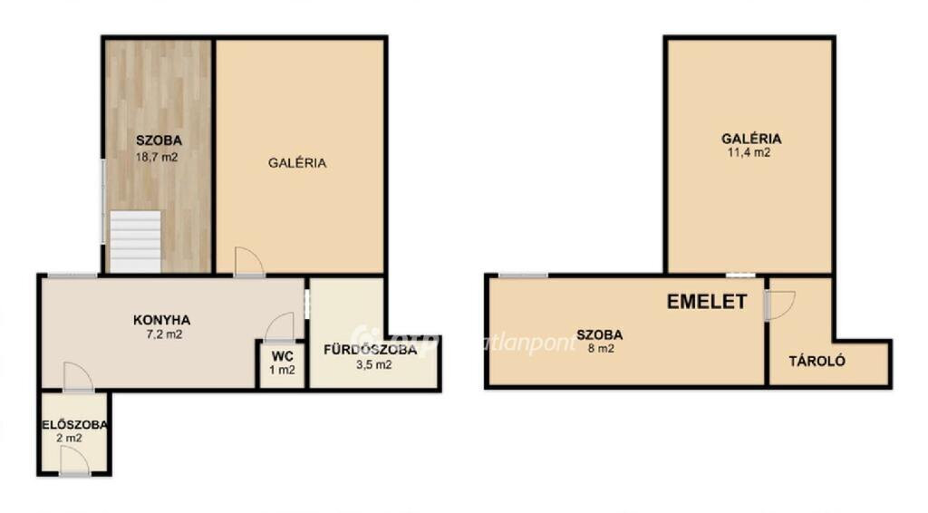 A lakás tulajdoni lap szerint 34 m2-es, 1 szobás, azonban a nagy (4 méteres) belmagasságnak köszönhetően kialakításra került egy 8 m2-es külön bejáratú szoba a konyha felett, valamint egy 11 m2-es galéria a nappaliban. A galérián a belmagasság 1,8 m.