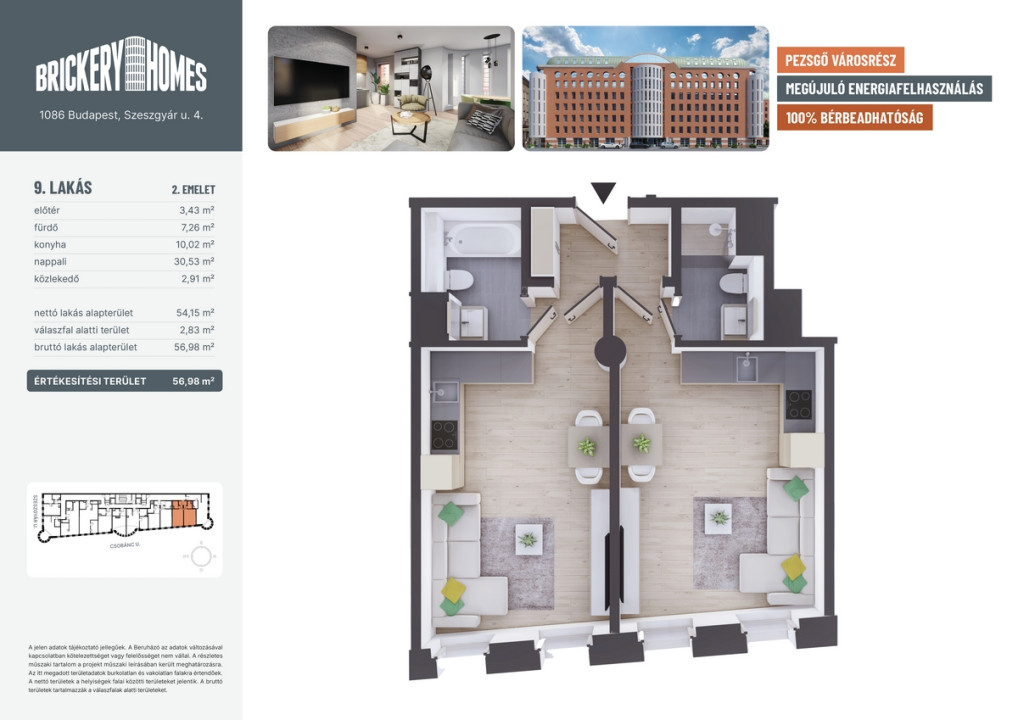 A lakók kényelmét többek között kerékpártároló, modern liftek, biztonsági rendszer, és a szomszédos épületben elérhető teremgarázs biztosítja. A Brickery Homes a klasszikus karaktert ötvözi a korszerű műszaki megoldásokkal – háromrétegű nyílászárók, energiahatékony fűtés-hűtés rendszer, hőszigetelt homlokzat, videós kaputelefon és okos beléptető rendszer gondoskodnak a kényelmes és biztonságos otthonélményről. Ha olyan lakást keresel, amely egyszerre hoz stílust, értéket és befektetési lehetőséget, jó helyen jársz.