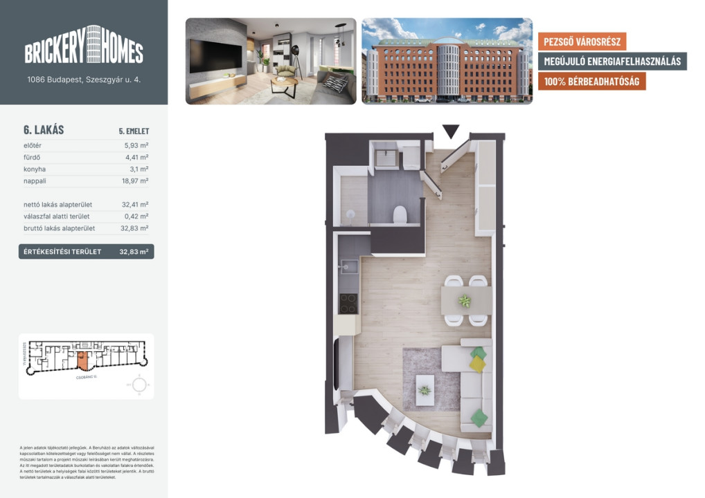 A lakók kényelmét többek között kerékpártároló, modern liftek, biztonsági rendszer, és a szomszédos épületben elérhető teremgarázs biztosítja. A Brickery Homes a klasszikus karaktert ötvözi a korszerű műszaki megoldásokkal – háromrétegű nyílászárók, energiahatékony fűtés-hűtés rendszer, hőszigetelt homlokzat, videós kaputelefon és okos beléptető rendszer gondoskodnak a kényelmes és biztonságos otthonélményről. Ha olyan lakást keresel, amely egyszerre hoz stílust, értéket és befektetési lehetőséget, jó helyen jársz.