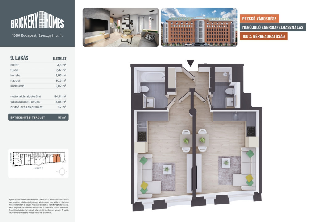 A lakók kényelmét többek között kerékpártároló, modern liftek, biztonsági rendszer, és a szomszédos épületben elérhető teremgarázs biztosítja. A Brickery Homes a klasszikus karaktert ötvözi a korszerű műszaki megoldásokkal – háromrétegű nyílászárók, energiahatékony fűtés-hűtés rendszer, hőszigetelt homlokzat, videós kaputelefon és okos beléptető rendszer gondoskodnak a kényelmes és biztonságos otthonélményről. Ha olyan lakást keresel, amely egyszerre hoz stílust, értéket és befektetési lehetőséget, jó helyen jársz.