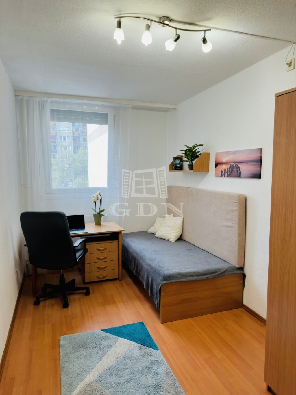 Az utcára néző széles, redőnnyel ellátott ablakok biztosítják a lakás világos és kellemes hangulatát.