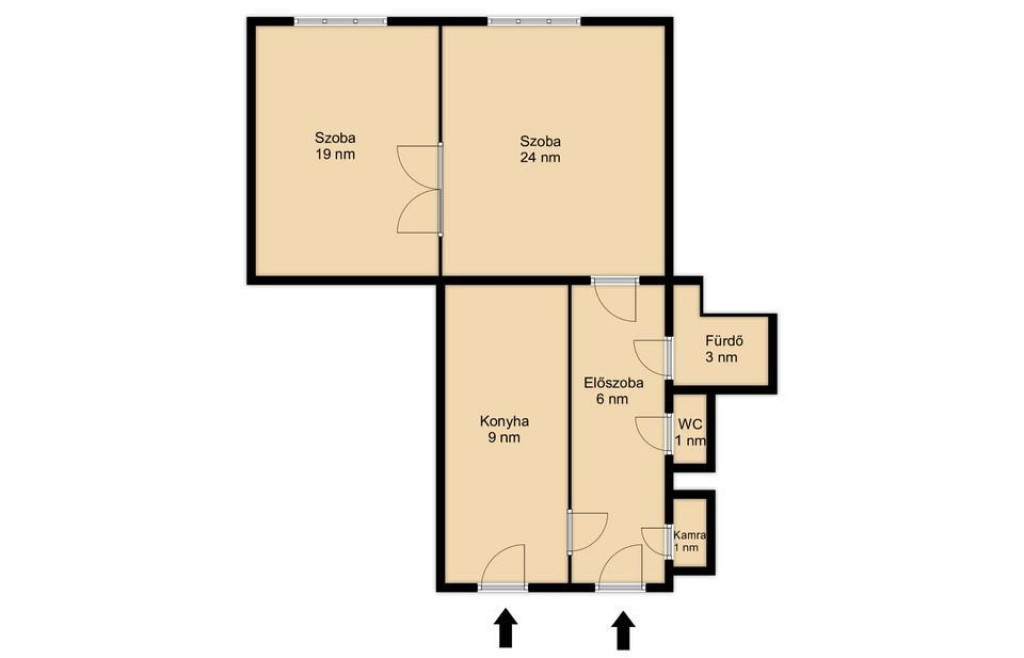 Az elrendezés praktikus: két tágas szoba, nagyméretű konyha-étkező, kamra, fürdőszoba, külön WC. Minden helyiség ablakos, szellőztethető. A terek arányosak, jól bútorozhatók, saját ízlés szerint alakíthatók. A lakáshoz pince tartozik.