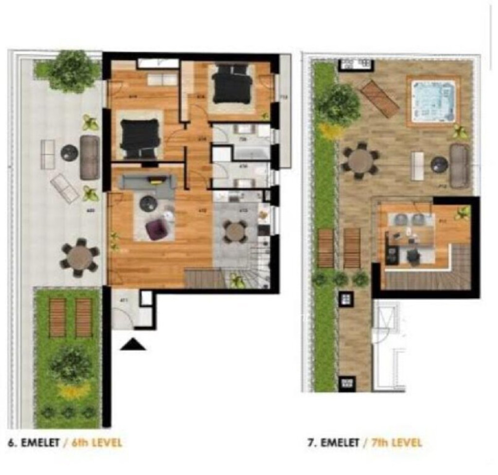 Különleges penthouse lehetőség Budapest VIII. kerületének folyamatosan fejlődő részén, a Csarnok negyedben, a Blaha Lujza tér és Körút szomzédságában. A 2023-ban épült, liftes, 54 lakásos társasház igényes anyaghasználattal, AA++ energetikai besorolással és korszerű hőszivattyús hűtés-fűtési rendszerrel valósult meg, ahol a hőleadás padlóban és mennyezetben történik, így a fenntartás rendkívül kedvező. A kínált ingatlan belső kétszintes, 96 m2 lakóterületű, 4 szobás, nyugati fekvésű lakás, amelyhez összesen 147 m2 terasz és egy 4 m?-es erkély tartozik. Különlegessége, hogy mindkét szint saját teraszkapcsolattal rendelkezik, így a lakás minden szinten erős kültéri kapcsolódást biztosít. A felső teraszokról tágas, levegős városi panoráma tárul elénk, ahonnan a Gellért-hegy, a Budai-hegység vonulata és a Hármashatár-hegy látványa is élvezhető, tovább erősítve a valódi penthouse-életérzést. A közös költség 50.400 Ft, amely már tartalmazza a hűtés-fűtés és a vízdíj költségét is. A lakás nem kulcsrakész, viszont teljesen szerkezetkész állapotban van: a gépészet, vezetékek és a fűtési rendszer kiépítve, így a végső kialakítás burkolatok, szaniterek, konyha már egyéni ízlés szerint valósítható meg. A meglévő tervek alapján kb. 20 millió Ft ráfordítással prémium szinten befejezhető. A vízellátású teraszok pergolával, zöldfelülettel, lounge-résszel, akár jacuzzival is kialakíthatók. Befektetői szempontból is kivételes lehetőség. Mélygarázs-beálló 8 M Ft-ért vásárolható.
