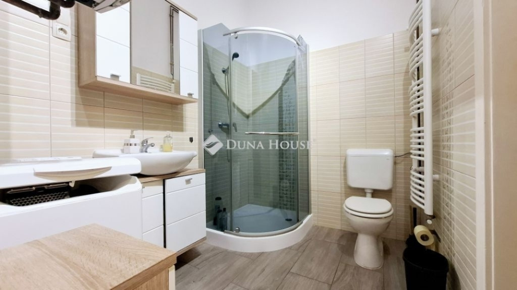 A fürdőszoba és a WC egy helyiségben került kialakításra, modern, praktikus elrendezéssel, zuhanyzóval. A fürdőszobába a nappaliból és a hálószobából is nyílik ajtó.