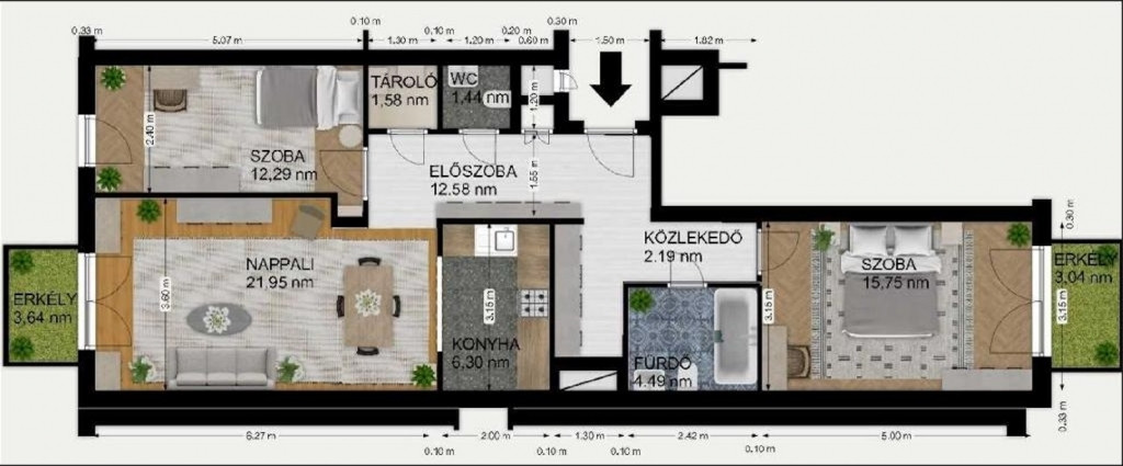 Az ingatlanban egy tágas, amerikai konyhás nappali kapott helyet (nappali 21,95 nm+ konyha 6,3 nm), emellett két külön bejáratú hálószoba, külön WC, kamra, kádas fürdőszoba, valamint két erkély is található.