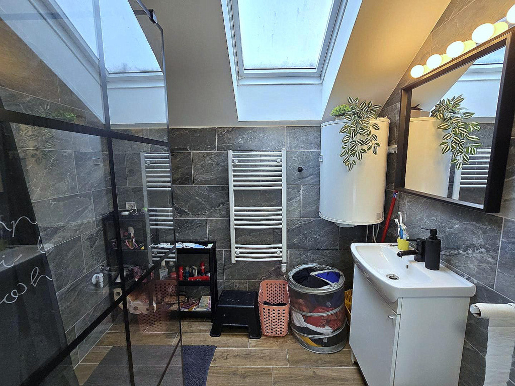 - Az emelet nemrégiben került beépítésre, kifejezetten modern, korszerű. Jól elszeparált az alsó szinttől. Igényes kialakítású fürdőszoba, modern, fiatalos nappali és hatalmas, 50 m2-es tetőterasz tartozik hozzá.