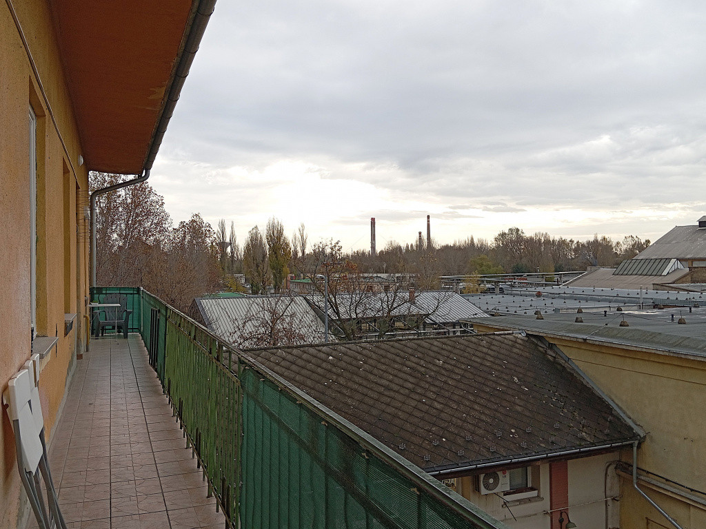 A 48 négyzetméteres, frissen kifestett, jó állapotú bekuckózós kis otthon tágas szobájának ablakai a Gyömrői útra néznek – de a szigetelt üvegtábláknak köszönhetően megtapasztalhatón biztosított a csend. Bejárata és konyhaablaka egy korábban jelentős munkahelyet biztosító ipari területre néz – ma már kisebb vállalkozások bérelnek itt épületrészeket.