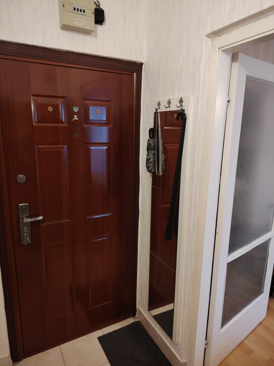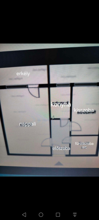 Rácsos kis előtér a bejárati ajtó előtt.Az előszobából balra Erkélyes, kényelmes méretű nappali található, jobbra a kádas fürdőszoba, szemben az ablakos konyha, a konyha mellett pedig a kisszoba található.