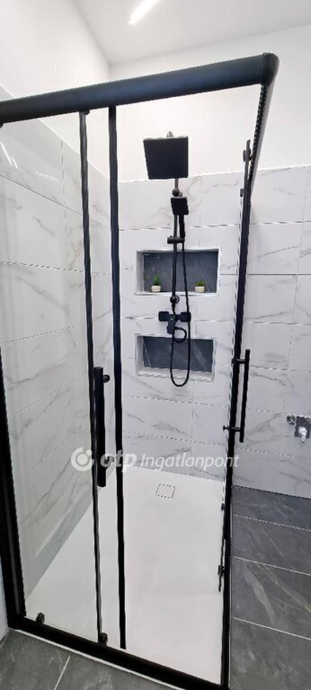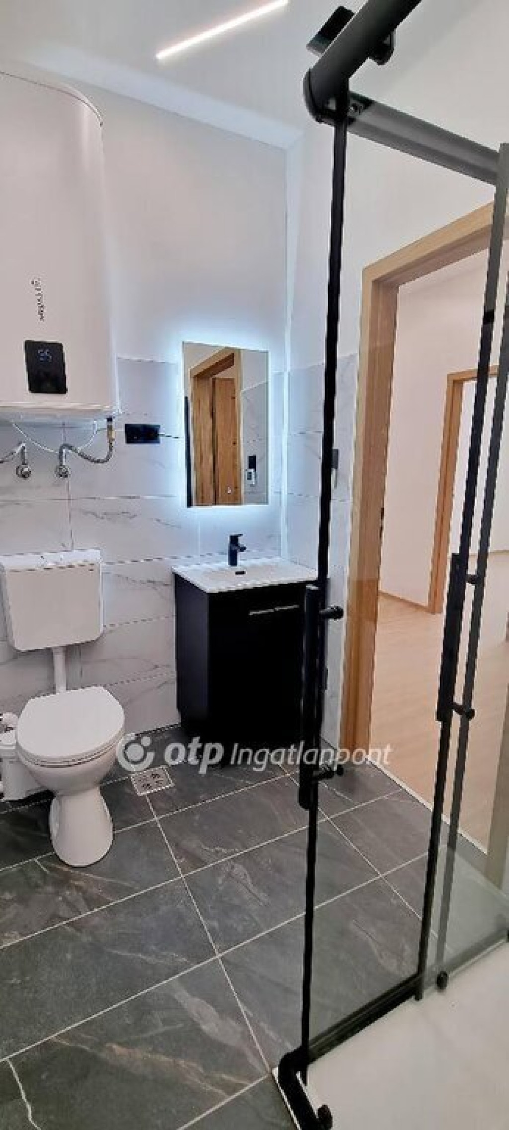Fürdőszobában nagy méretű (90 cm ×120 cm) zuhanyzót helyeztek el gránit tálcával, kétfelé nyíló görgős ajtóval, és esőztetős zuhannyal + hangulatvilágítással látták el. További 2 beépített, LED-es polc segíti a pakolást. A mosó- és szárítógépek kiállását megcsinálták. Modern, LED-es tükör került felszerelésre.