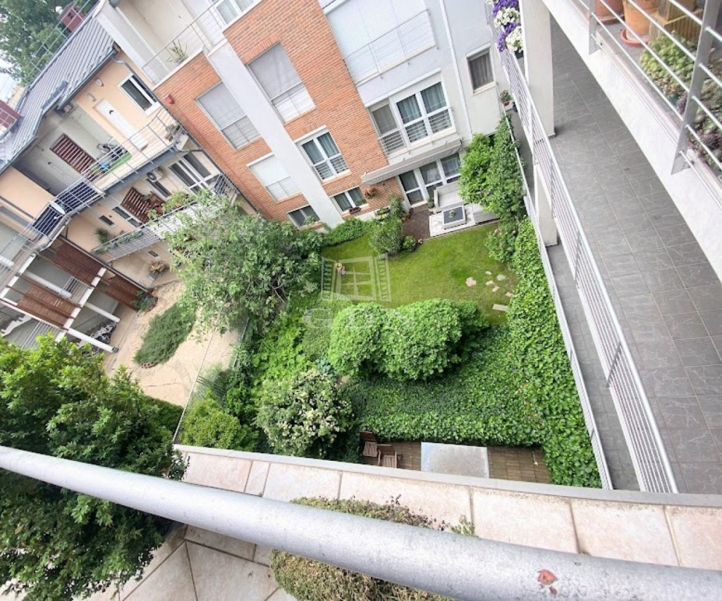 A ház lépcsőháza átriumos belső zárt udvarral, örökzöldekkel kialakított, belső lejárattal a teremgarázsokhoz és a tárolóhoz.