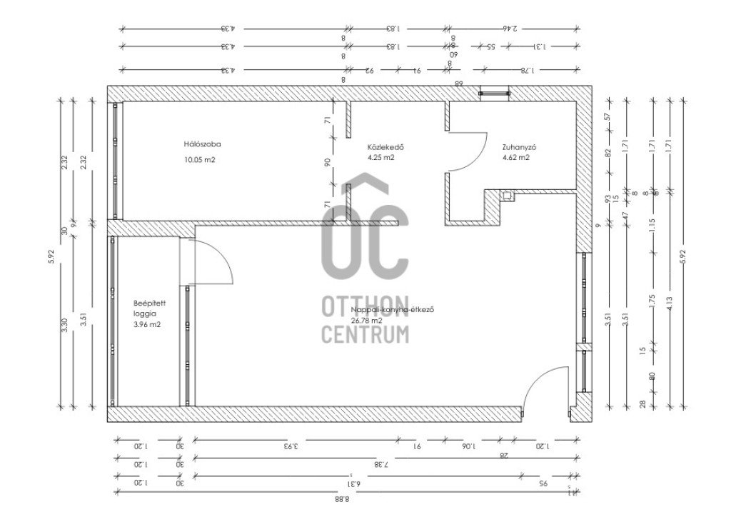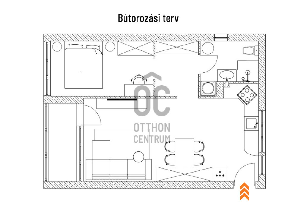 * A lakás elosztása: nappali-konyha-étkező, közlekedőből külön nyíló hálószoba, zuhanyzó mellékhelyiséggel, beépített loggia.