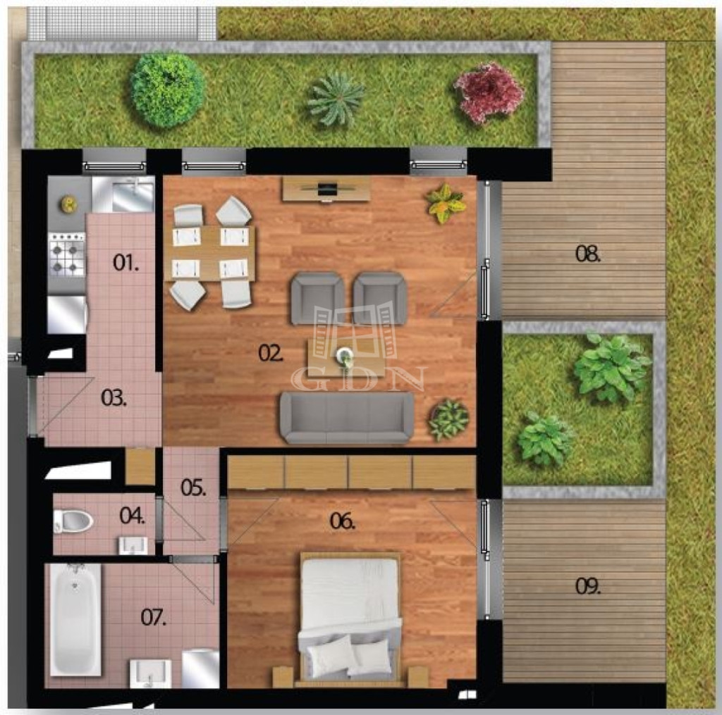 FÖLDSZINTI, nappali + 1 hálószobás, 2 terasszal még elérhető!
