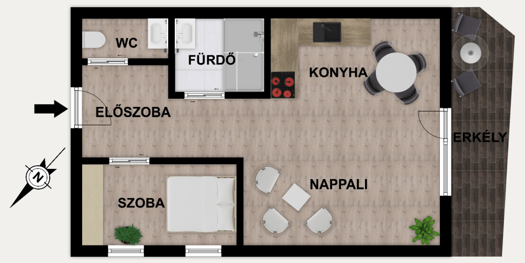 Alsóhegy utca 28. 46 m2, 1. emelet, amerikaikonyhás nappali, háló, fürdő, wc, közlekedő. Az ablakok az Alsóhegy utca felé néznek, az erkély 5 m2.