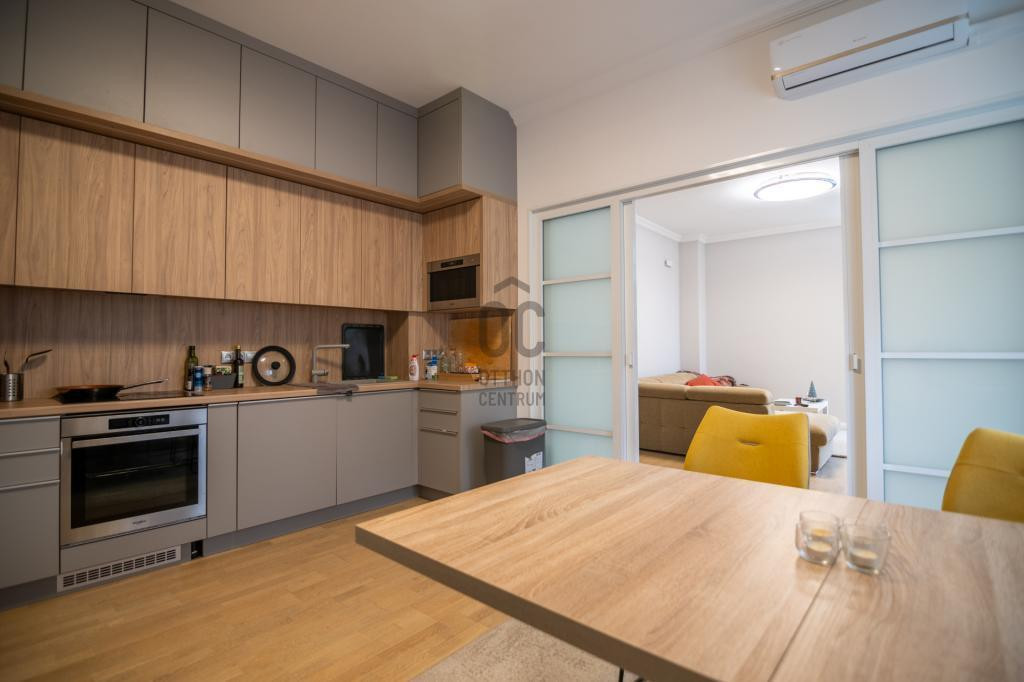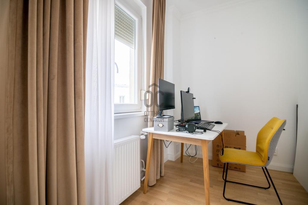 Helyiségek: tágas nappali (24 m²), három különnyíló szoba, nagy étkezős konyha (16 m²), fürdő + WC, külön WC, gardrób, közlekedők.