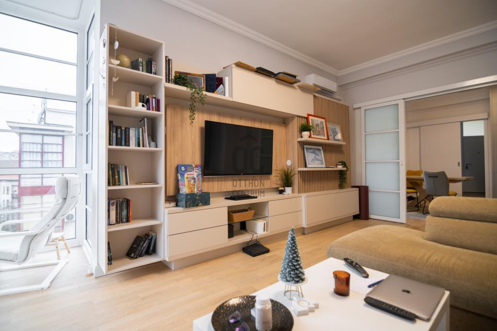 Nappalija szuper világos, mivel az erkély rész teljesne be lett építve és ott fal helyett végig üveg van.