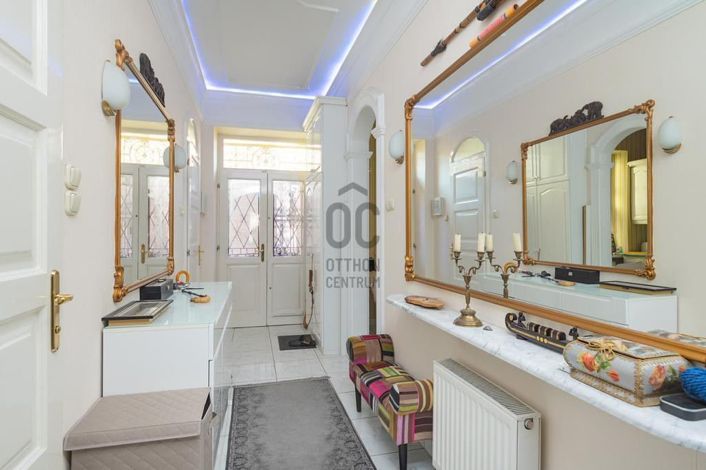 A lakásban számos praktikus beépített tároló található, egyedi kovácsoltvas ajtókkal, amelyeket különleges üvegdíszítés tesz egyedivé.