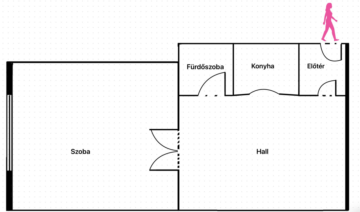 A lakás a földszinten helyezkedik el, utcai fekvésű. Egy szoba, hall, kis teakonyha, fürdőszoba, előszoba helyiségekből és pincei tárolóból áll.