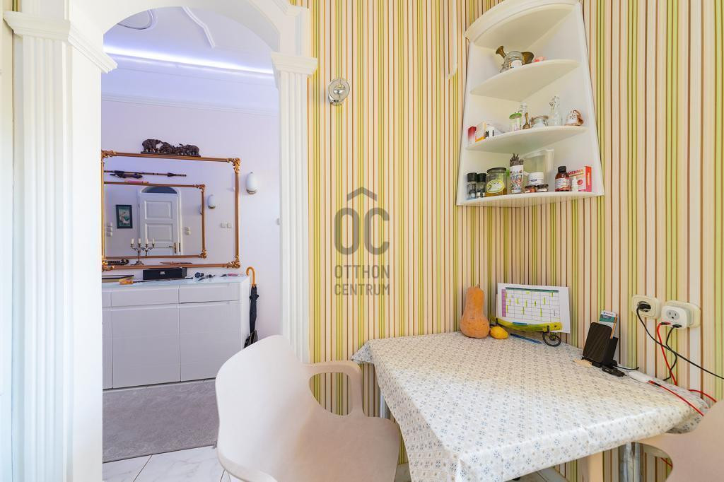 A lakásban számos praktikus beépített tároló található, egyedi kovácsoltvas ajtókkal, amelyeket különleges üvegdíszítés tesz egyedivé.