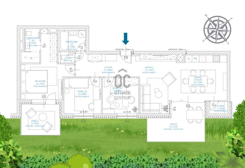 - Elosztása: közlekedő, konyha+étkező, nappali+ 3 szoba, 2 fürdőszoba, WC, kamra, nagy terasz és külön erkély.