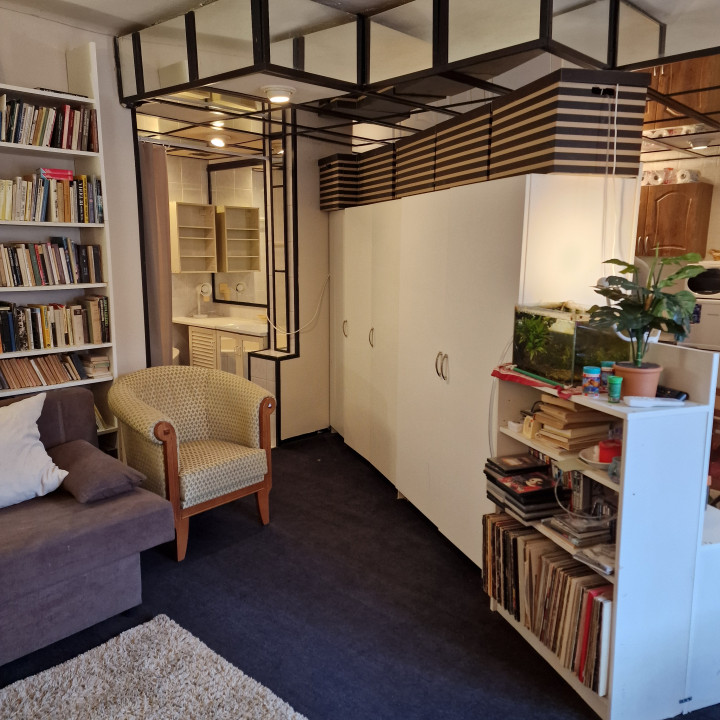 A konyhát és étkezőt közel mennyezetig érő szekrényekkel határolták el a dobogóval megemelet nappalitól, amely hálószobaként is funkciónál.