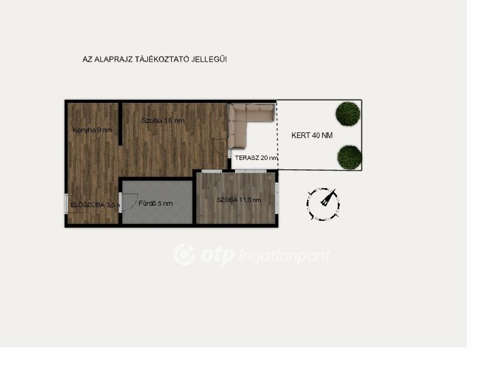 A szobából kiléphetünk egy 20 m2-es, szilárd burkolatú teraszra, majd az elkerített, saját használatú, 40 m2-es kertbe, melynek gondozását egy szakcég végzi, ennek költsége a közös költség része.