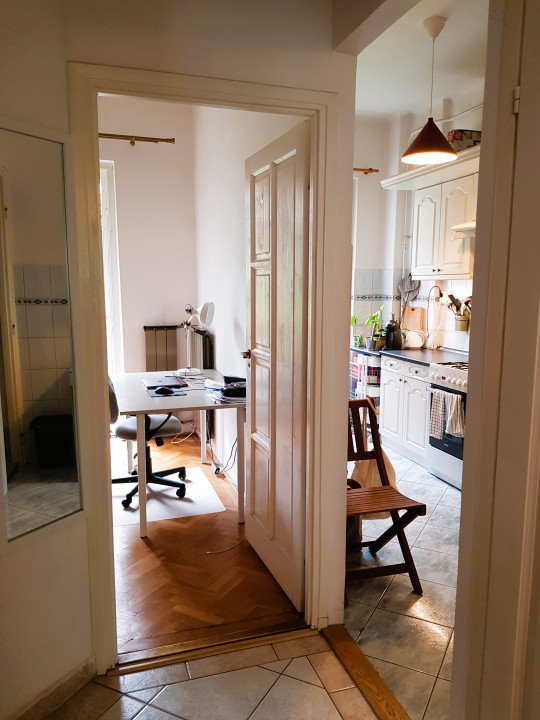 benne kis kamra, és modern konyhabútor.