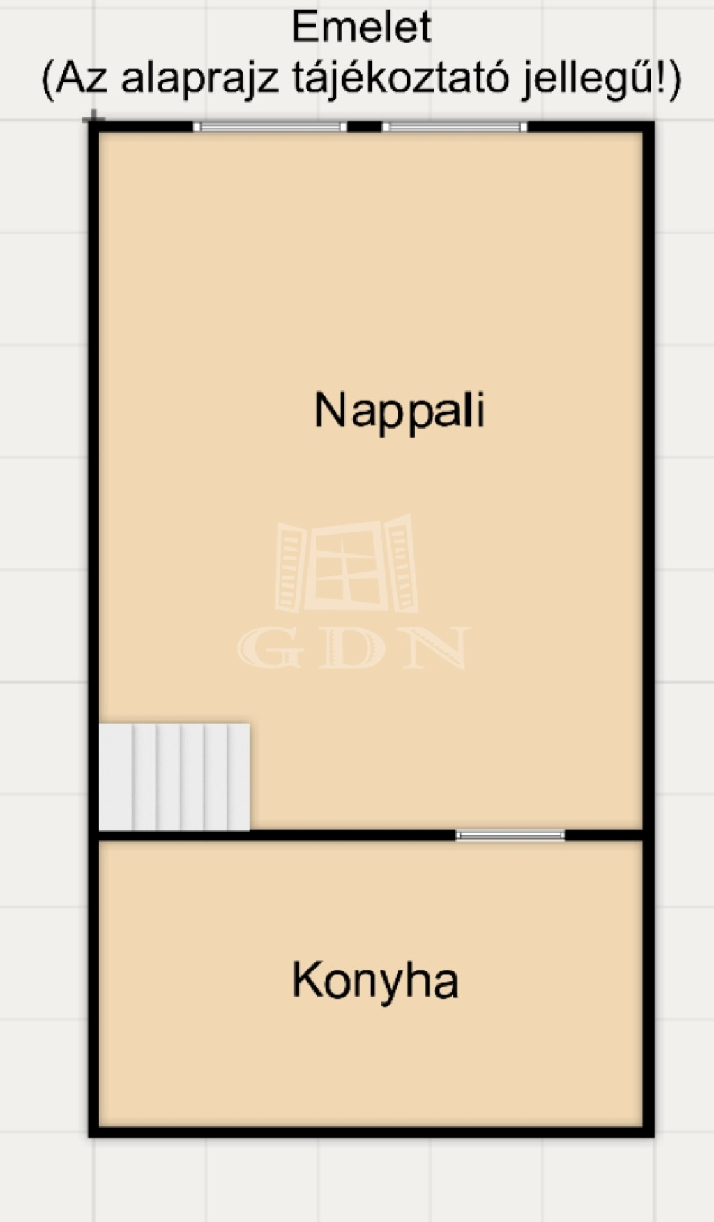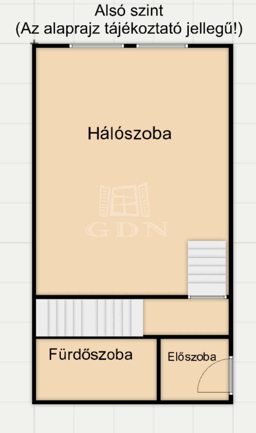 Az alsó szinten található a hálószoba és a fürdő, az emeleti szinten pedig egy tágas nappali kapott helyet – ideális elrendezés kényelmes mindennapokra.