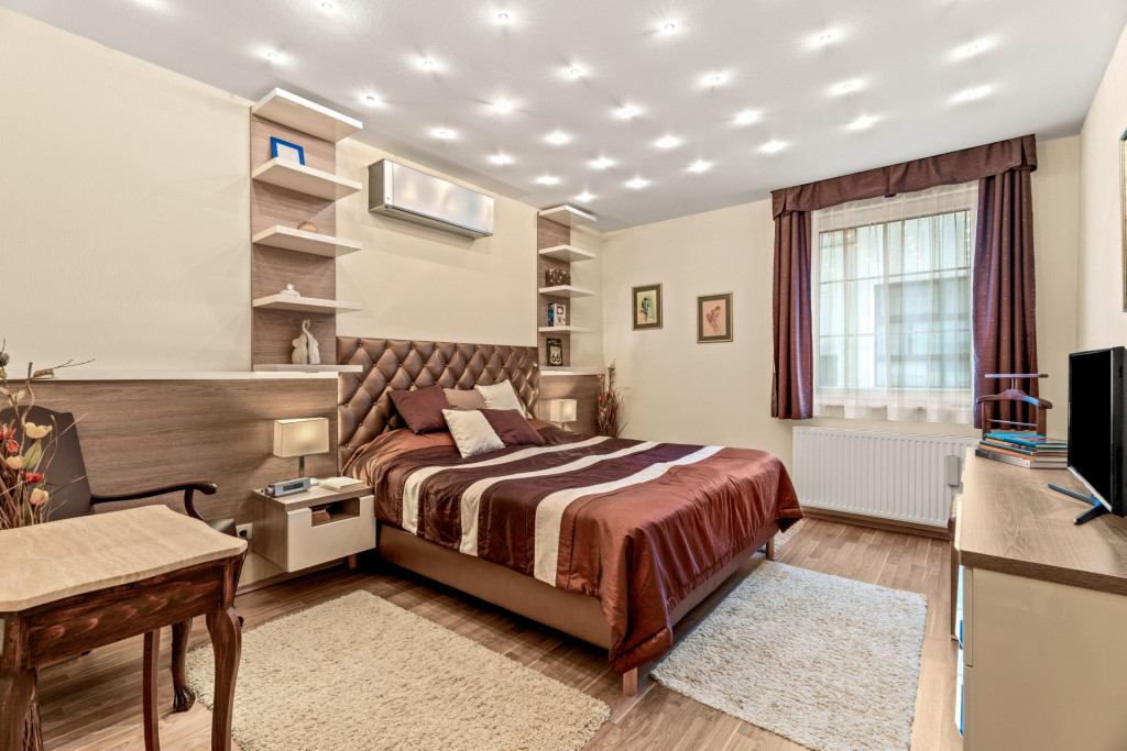 Fűtése saját gázkazánról működik radiátorokkal és padlófűtéssel, hűtését minden helyiségben klíma biztosítja. A lakás kiválóan felszerelt: