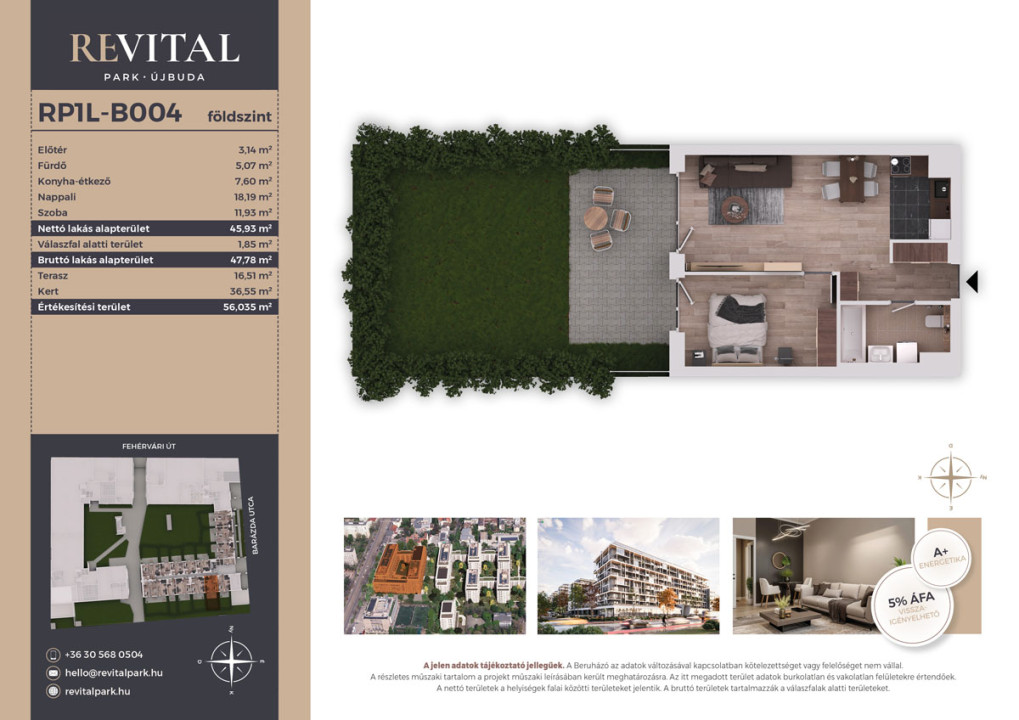 Frekventált elhelyezkedés, fejlődő környezet A Revital Park a XI. kerület szívében, a Fehérvári út 120. szám alatt épül, kiváló közlekedési kapcsolatokkal: a közelben több villamosjárat (1-es, 41-es, 47-es), buszmegállók és metróvonal is elérhető, az autós közlekedés számára pedig az M1–M7–M0 útvonalak néhány percen belül elérhetők. A környék szolgáltatásokban gazdag – a közelben bevásárlóközpontok (Savoya Park, Allee), helyi piac, bölcsődék, iskolák, rendelők, sport- és rekreációs lehetőségek is találhatók. A Feneketlen-tó, a Bikás park és a Duna-part 15 percen belül elérhetők gyalogosan – így a zöld nyugalom és a városi dinamika valóban kéz a kézben jár.