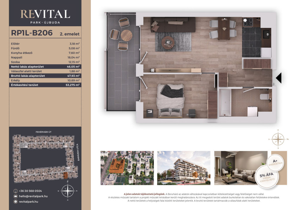 Frekventált elhelyezkedés, fejlődő környezet A Revital Park a XI. kerület szívében, a Fehérvári út 120. szám alatt épül, kiváló közlekedési kapcsolatokkal: a közelben több villamosjárat (1-es, 41-es, 47-es), buszmegállók és metróvonal is elérhető, az autós közlekedés számára pedig az M1–M7–M0 útvonalak néhány percen belül elérhetők. A környék szolgáltatásokban gazdag – a közelben bevásárlóközpontok (Savoya Park, Allee), helyi piac, bölcsődék, iskolák, rendelők, sport- és rekreációs lehetőségek is találhatók. A Feneketlen-tó, a Bikás park és a Duna-part 15 percen belül elérhetők gyalogosan – így a zöld nyugalom és a városi dinamika valóban kéz a kézben jár.