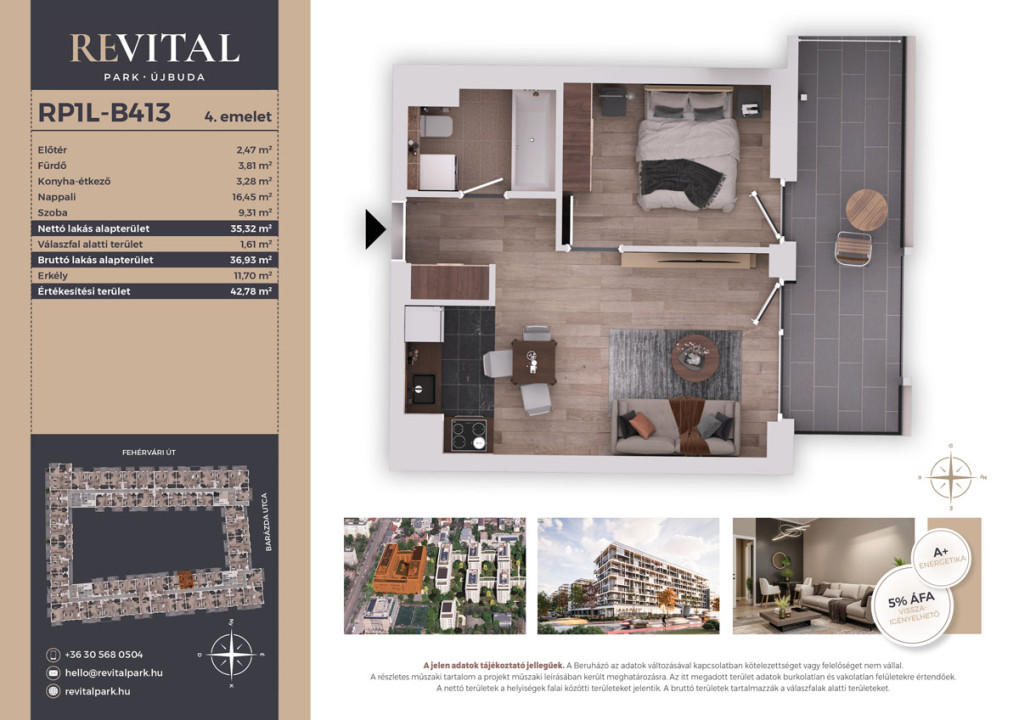 Frekventált elhelyezkedés, fejlődő környezet A Revital Park a XI. kerület szívében, a Fehérvári út 120. szám alatt épül, kiváló közlekedési kapcsolatokkal: a közelben több villamosjárat (1-es, 41-es, 47-es), buszmegállók és metróvonal is elérhető, az autós közlekedés számára pedig az M1–M7–M0 útvonalak néhány percen belül elérhetők. A környék szolgáltatásokban gazdag – a közelben bevásárlóközpontok (Savoya Park, Allee), helyi piac, bölcsődék, iskolák, rendelők, sport- és rekreációs lehetőségek is találhatók. A Feneketlen-tó, a Bikás park és a Duna-part 15 percen belül elérhetők gyalogosan – így a zöld nyugalom és a városi dinamika valóban kéz a kézben jár.