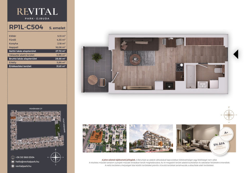A Revital Park a XI. kerület új városrésze – ahol valódi zöld környezet, korszerű technológia és élhető városi élet találkozik. A projekt első ütemében 421 lakás épül egy átfogó, 8 ütemes fejlesztés részeként, egy teljesen megújuló, parkosított környezetben. A lakások kialakítása nemcsak korszerű, hanem jövőálló: minden otthon alapfelszereltségként elektromos redőnykiépítéssel és okosotthon-rendszerrel érkezik, a felülethűtés-fűtés mennyezetbe integrált, láthatatlan, csendes komfortot biztosít. A zárt erkélyek időjárásálló, valóban használható kültéri tereket kínálnak, a zöldtetők és kilátópontok pedig a városi természetélményt hozzák közel.