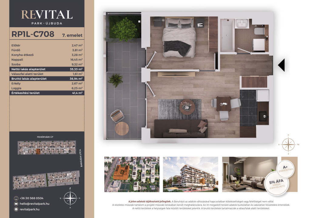 Frekventált elhelyezkedés, fejlődő környezet A Revital Park a XI. kerület szívében, a Fehérvári út 120. szám alatt épül, kiváló közlekedési kapcsolatokkal: a közelben több villamosjárat (1-es, 41-es, 47-es), buszmegállók és metróvonal is elérhető, az autós közlekedés számára pedig az M1–M7–M0 útvonalak néhány percen belül elérhetők. A környék szolgáltatásokban gazdag – a közelben bevásárlóközpontok (Savoya Park, Allee), helyi piac, bölcsődék, iskolák, rendelők, sport- és rekreációs lehetőségek is találhatók. A Feneketlen-tó, a Bikás park és a Duna-part 15 percen belül elérhetők gyalogosan – így a zöld nyugalom és a városi dinamika valóban kéz a kézben jár.
