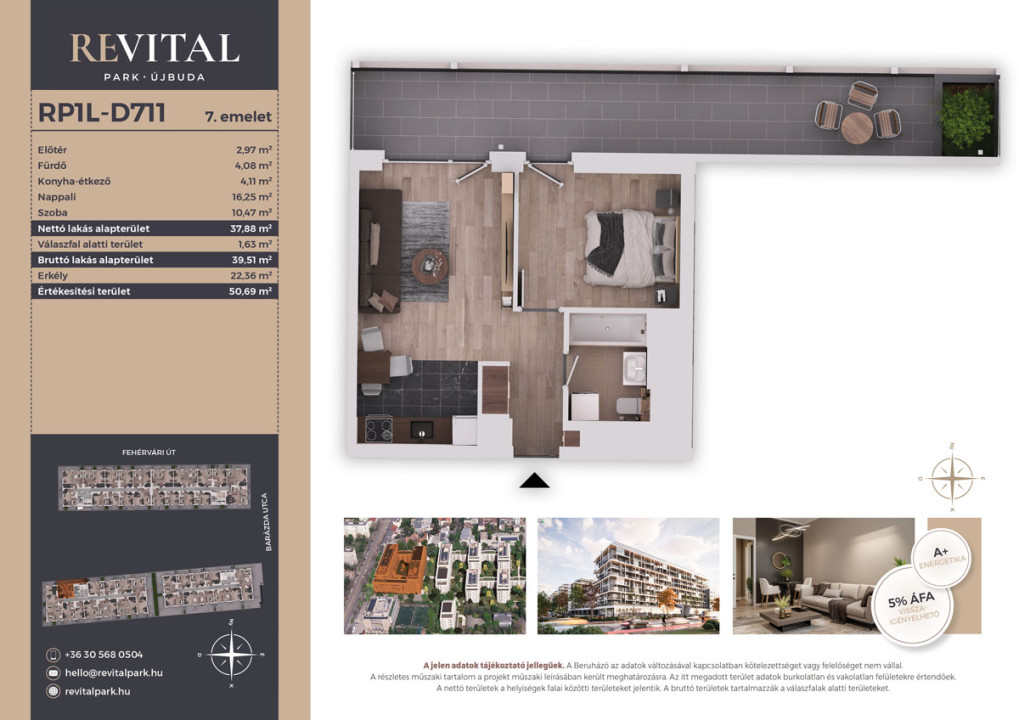 Frekventált elhelyezkedés, fejlődő környezet A Revital Park a XI. kerület szívében, a Fehérvári út 120. szám alatt épül, kiváló közlekedési kapcsolatokkal: a közelben több villamosjárat (1-es, 41-es, 47-es), buszmegállók és metróvonal is elérhető, az autós közlekedés számára pedig az M1–M7–M0 útvonalak néhány percen belül elérhetők. A környék szolgáltatásokban gazdag – a közelben bevásárlóközpontok (Savoya Park, Allee), helyi piac, bölcsődék, iskolák, rendelők, sport- és rekreációs lehetőségek is találhatók. A Feneketlen-tó, a Bikás park és a Duna-part 15 percen belül elérhetők gyalogosan – így a zöld nyugalom és a városi dinamika valóban kéz a kézben jár.