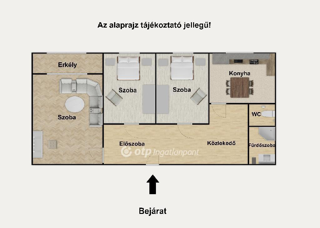 A lakás jelenlegi elosztása ideális: nappali + 2 külön nyíló hálószoba, így kiváló választás lehet kisgyermekes családoknak vagy akár befektetésre is.