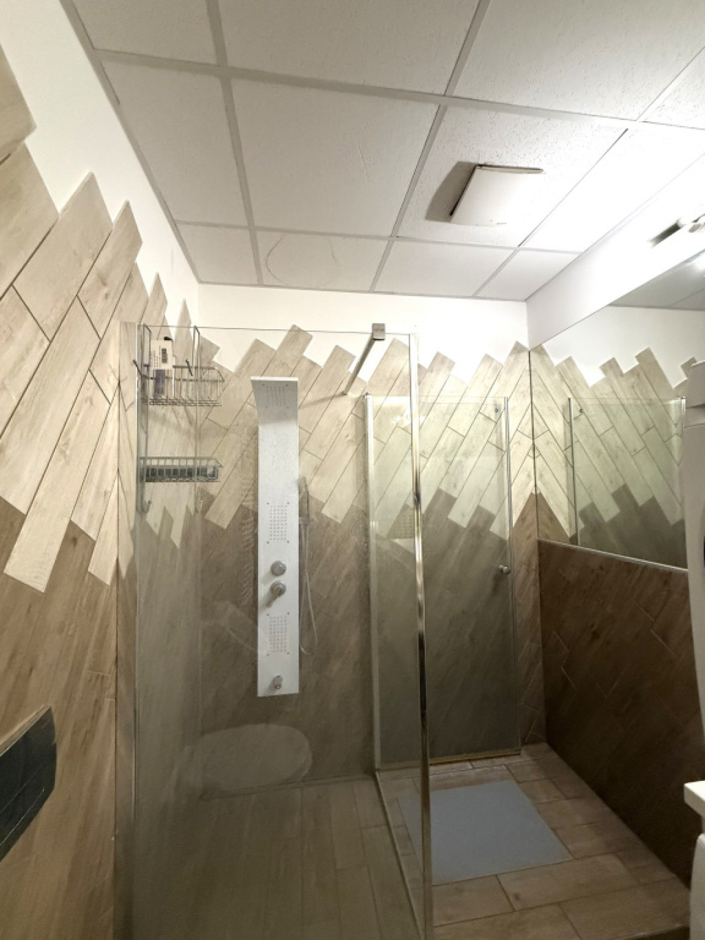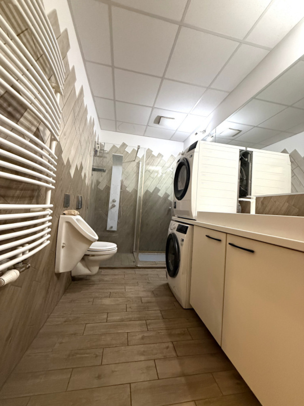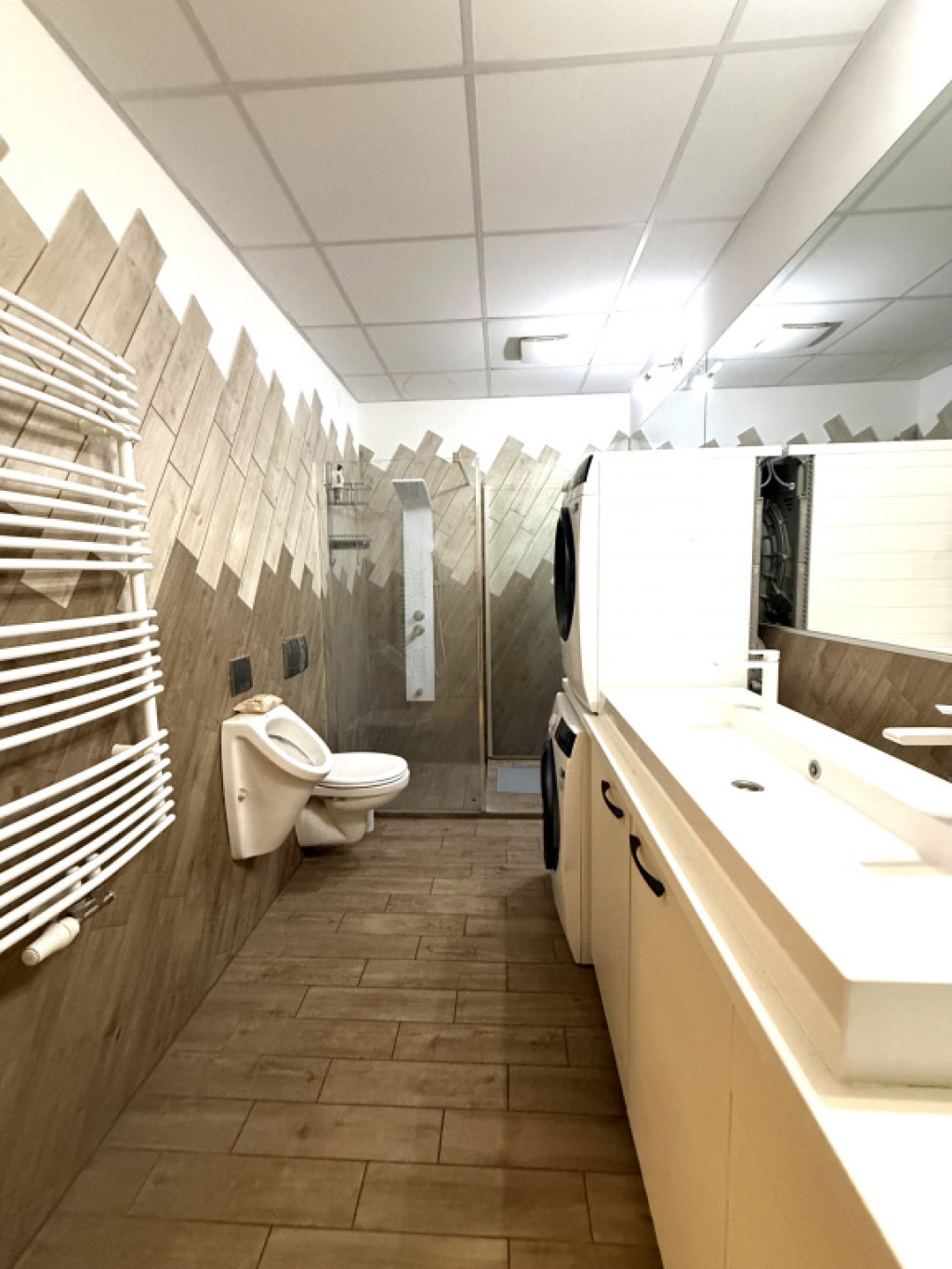 A fürdőszoba zuhannyal, mosdóval, tolettel, piszoárral felszerelt.
