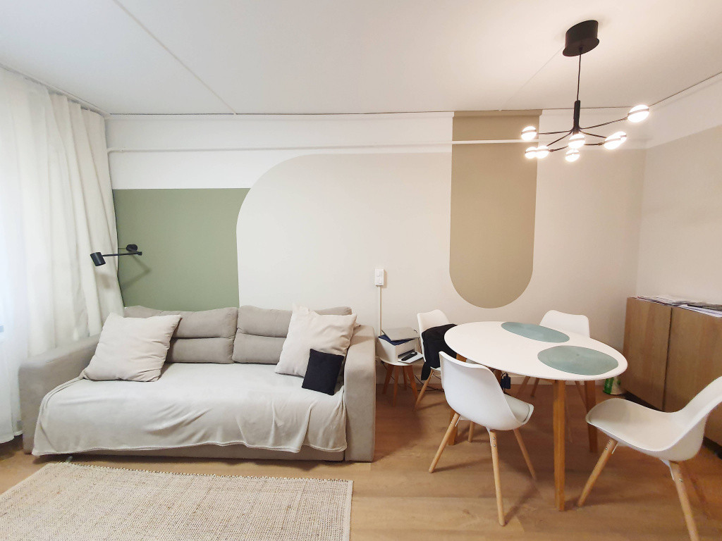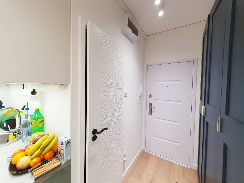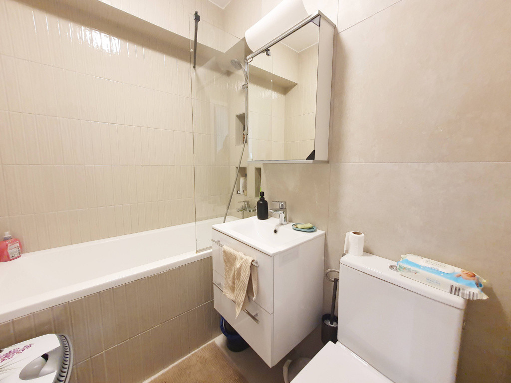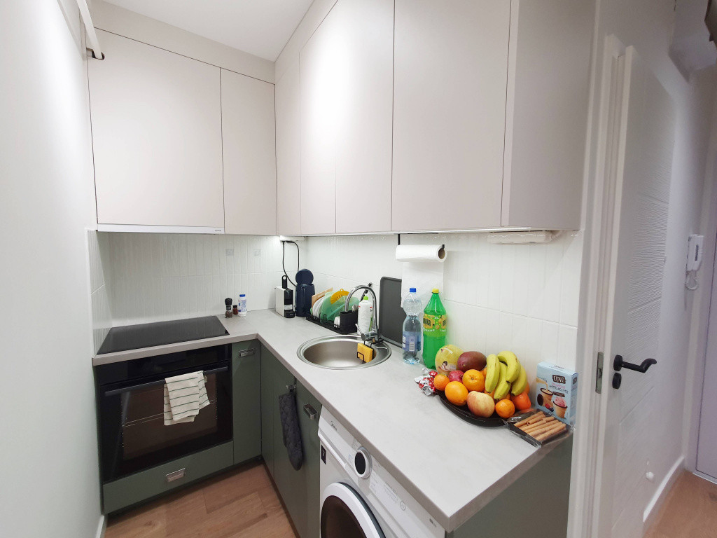 A nappali 17 nm-es, benne étkezőnek vagy dolgozó saroknak kialakítható tér. A konyha modern és praktikus elrendezésű, elegáns fürdőszoba pedig káddal, törölköző szárítóval és wc-vel biztosítja a kényelmet. A terek tökéletes kihasználást lakberendező tervezte, MODERN DESIGN.