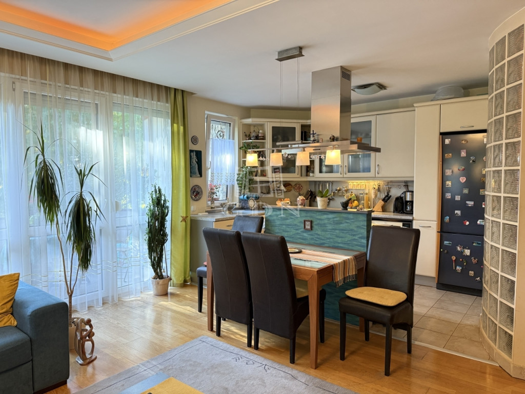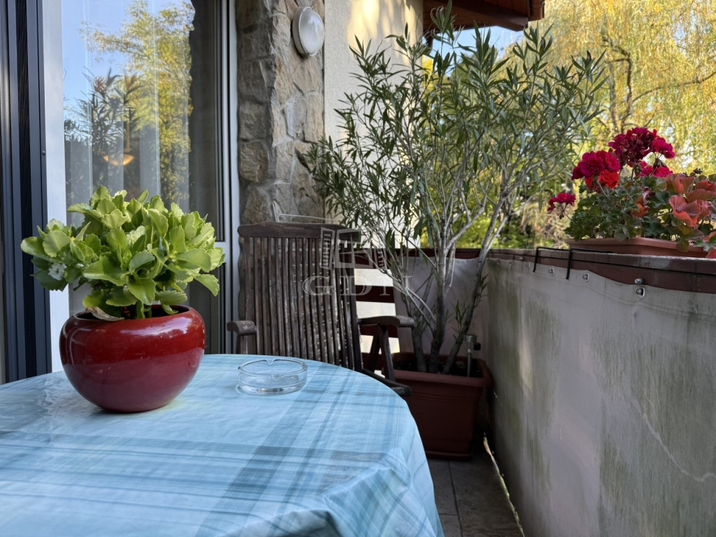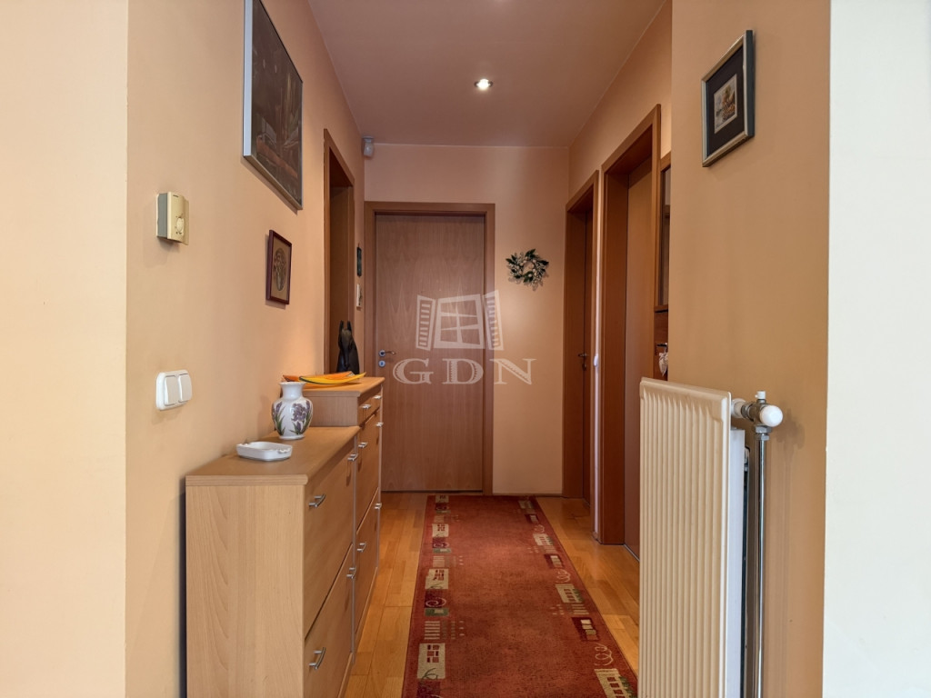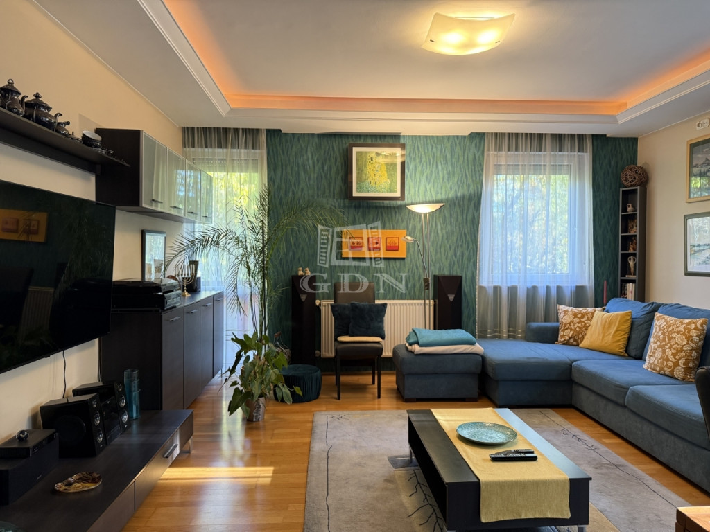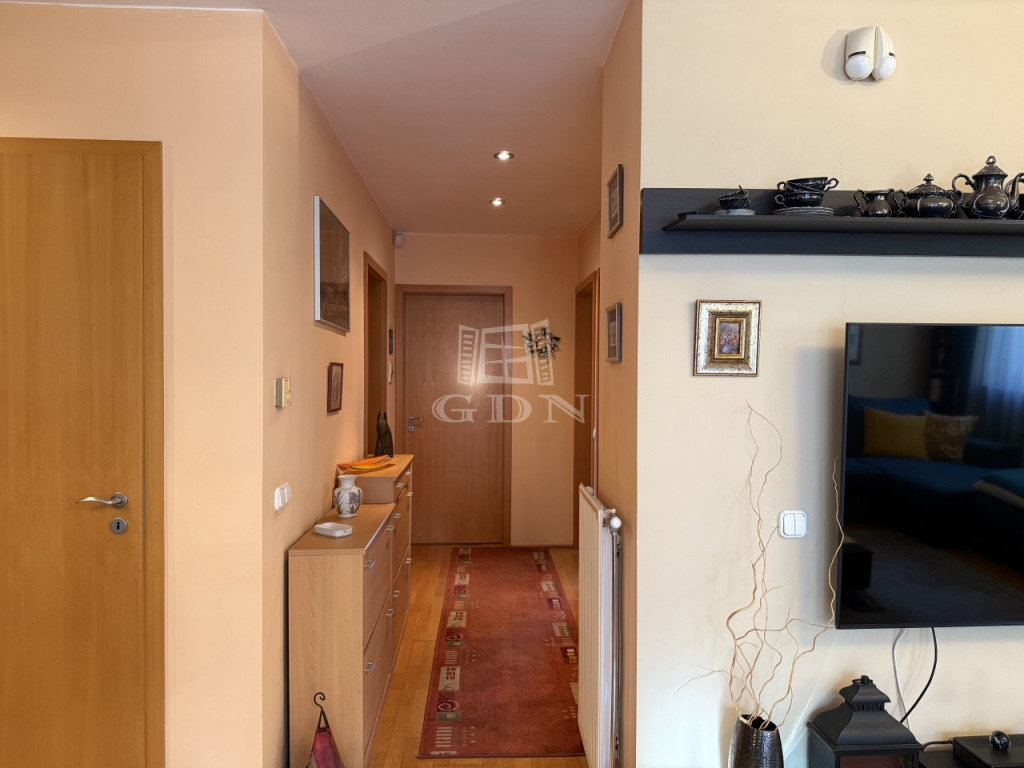 Az ingatlan 2004-ben épült, mindössze öt lakásos társasházban található, első emeleti, 81 m²-es, kifogástalan állapotú, amerikai konyhás nappalival és három hálószobával. A jól átgondolt elrendezés mellett két erkély (az egyik amerikai konyhás nappaliból nyílik, a másik pedig az egyik halószobából), ablakos fürdőszoba, külön vendég-WC, gardrób, két teremgarázs-hely és 7 m²-es tároló is tartozik hozzá.